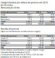 Por isso, neste texto, tomamos como base no trabalho denominado Carga Tributária Global do Brasil em 2010, de Afonso, José Roberto e Castro, Kleber, cuja metodologia, segundo os autores, considera, para efeito de carga tributária toda receita pública que é extraída compulsoriamente da sociedade, diferindo da maioria das estimativas por incluir rubrica como royalties, contribuições econômicas, juros, multas e dívida ativa de tributos.
