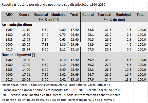 Nesse período, a arrecadação própria dos municípios passou de 0,8% do PIB para 2,12%, com uma participação no total nacional de 1,1% para 6,42%. Incluindo as transferências da União e dos estados, a participação dos Municípios  passou de 6,6% para 18,3%, tendo quase triplicado, embora o número deles tenha passado de 2.765 em 1980 para 5.565 em 2010, mais do que o dobro. Os Estados, por seu turno, foram os que mais perderam, ao passarem de 34% do PIB  em 1960 para  para 24,7% em 2010.