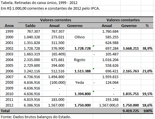 A Tabela no final mostra o total sacado do caixa único por governo, desde 1999 até 2012, em valores correntes e constantes, pelo  IPCA. O total sacado foi de R$ 6.386.916 mil e R$ 9.419.725 mil, respectivamente.