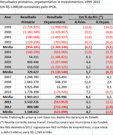 A Tabela no final mostra os resultados primários e orçamentários no período 1999-2012, onde se constata o seguinte: