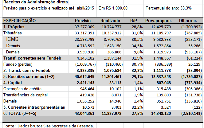 Considerando que o mês de abril representa 33,3% do exercício, calculamos a arrecadação proporcional e diminuímos da receita realizada até então. A receita de capital não obedece a essa proporcionalidade, mas corrente tem mais ou menos esse comportamento.